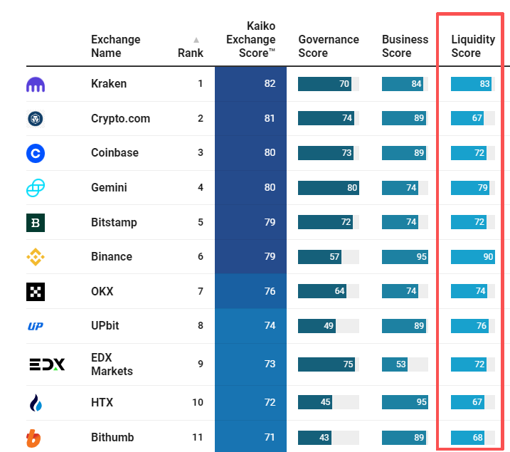 前段提过的Kaiko 在每季的交易所排名报告中有提供流动性评分: