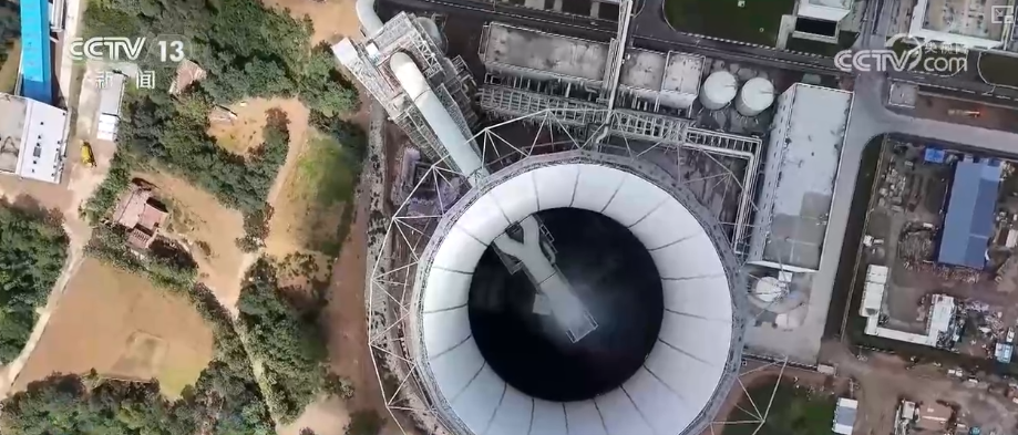 这个27层楼高的巨型装置就是捕捉二氧化碳的关键设施——吸收塔。发电机组排放的燃煤烟气里的二氧化碳就是在这里被捕捉收集,它的捕集率超过90%。它一小时处理二氧化碳的能力相当于18000人一天生活的碳排放。