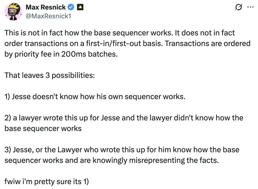 专注于 Solana 的研发公司 Anza 的**经济学家 Max Resnick 就针对 Jesse Pollak 的说法提出了质疑,Max Resnick 表示 Base 的排序器是以 200 毫秒为单位以优先级费用对交易进行排序,并非是遵循先进先出原则。虽然之后 Jesse Pollak 对此进行了解释,但很明显 Max Resnick 想要表达的关键点就是排序器是可以按照某些规则对交易重新排序的,直指排序器**化的问题。