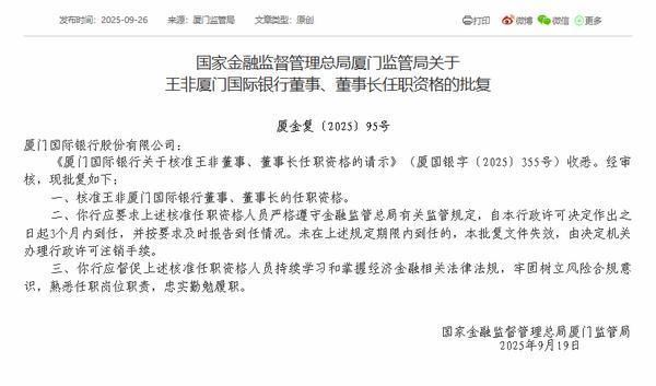 厦门国际银行董事长王非任职资格获批 作者:LR •更新时间:2025-09-26 17:16:18•阅读 0 财经9月26日讯 今日,**金融监督管理总局厦门监管局公布批复显示,核准王非厦门**银行董事、董事长的任职**。 张紫祎