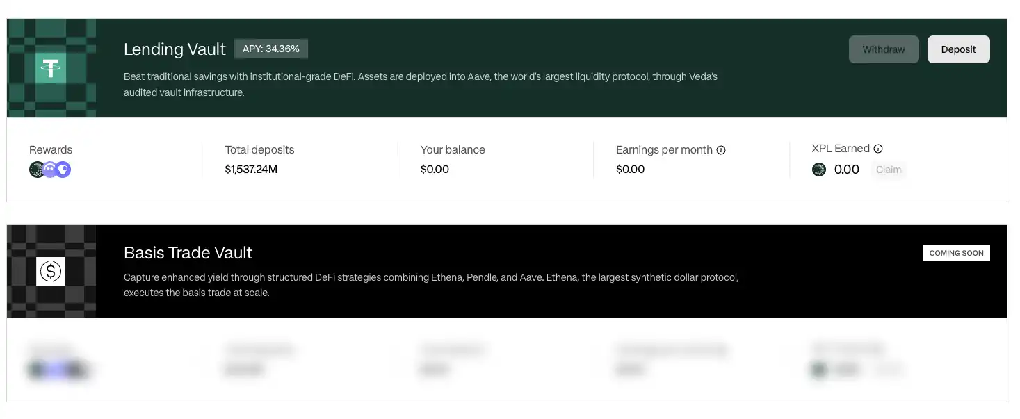 这个活动是 Pla**a 官方发起的,在 Veda 协议下的 Pla**aUSD Vault 以持币挖矿的形式发放 WXPL,当前只开放了 Lending Vault,未来也会开放 Basis Trade Vault。