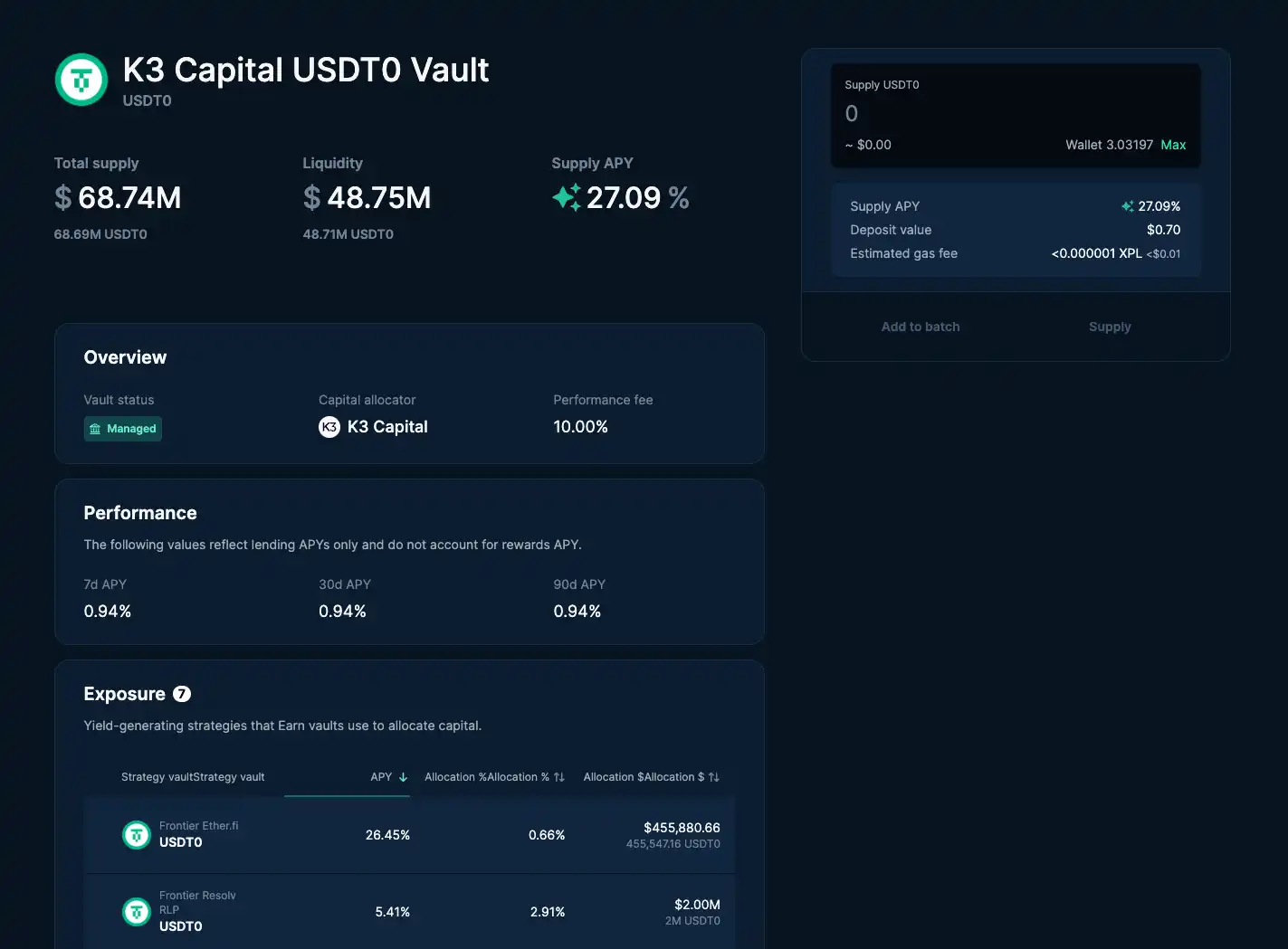 在 Pla**a 的 Euler 协议中,由 K3 Capital 管理的 USDT0 Vault 当前年化收益率大约为 27%,每日激励分配约 5.5 万美元等值的 WXPL。