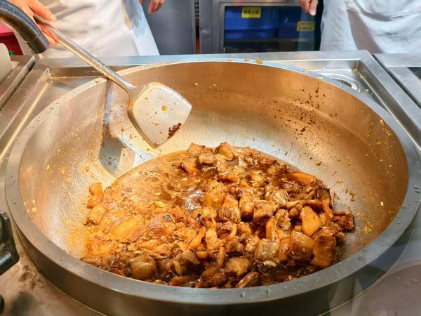 以一道猪排烩酸菜为例,原本,这道菜中的猪排是**厨房熟制后配送到门店,根据点单情况再加入酸菜炒制出餐,现在则**是后厨现切现做。“炒猪排需要准备猪五花、猪前肩肉、猪排三种肉,根据油脂比例先后下锅,炒熟一锅猪排需要40分钟。”厨师长表示,猪排备好后,还需加入酸菜、土豆等配菜按份炒制出餐,而一锅猪排能制作19份猪排烩酸菜。“如果打烊有剩余,也只会报损处理,**隔夜。”