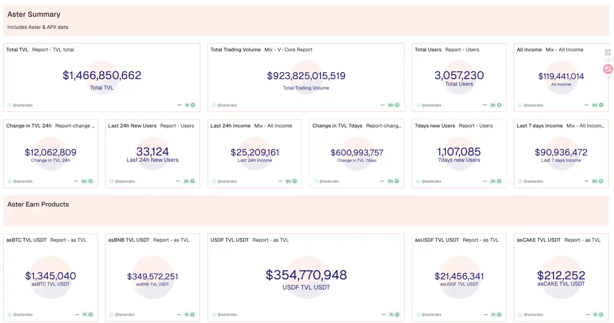 根据 Dune 上的**数据,Aster 在多个关键指标上的增长表现相当亮眼。总锁仓价值(TVL)达到 14.67 亿美元,充分体现了项目的资金吸引力和市场认可度。更厉害的是累计交易量突破 9238 亿美元,这个数字不仅体现了平台的交易活跃程度,更反映出用户对平台的高度粘性和信任。用户规模方面,平台已经积累了 305.7 万总用户,为项目长期发展打下了坚实基础。协议累计收入 11.94 亿美元,**证明了平台盈利模式的有效性。