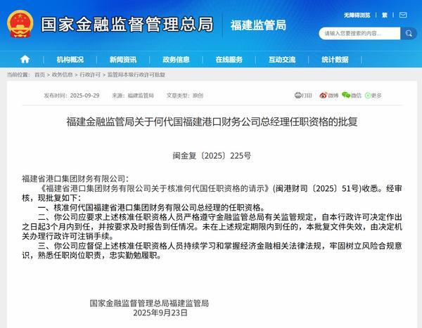 何代国获批担任福建港口财务公司总经理 作者:LR •更新时间:2025-09-30 10:16:29•阅读 0 财经9月30日讯 昨日,福建金融监管局公布相关批复,核准何代国福建省港口集团财务有限公司(简称“福建港口财务公司”总经理的任职**。以下是相关批复正文: