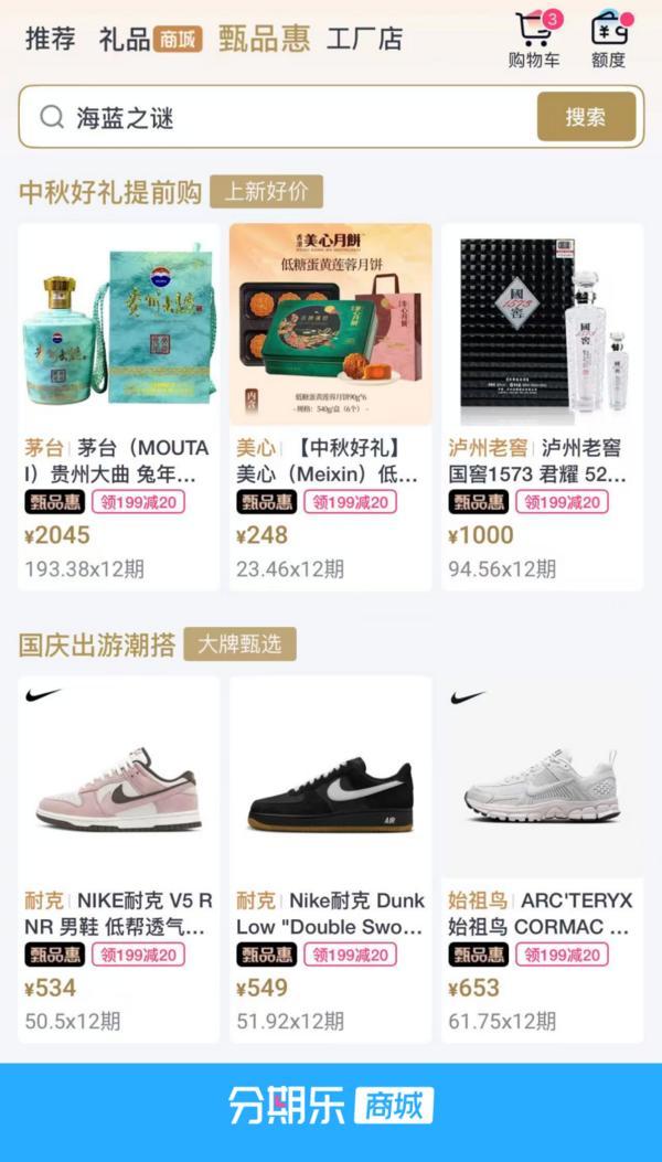 针对双节期间两大核心消费场景——中秋团聚送礼与假期出行,分期乐商城依托 “甄品惠” 模式搭建主题消费场景,精准匹配消费需求。“中秋好礼提前购” 活动聚合酒水、食品、礼品等品类的热门**,包括高端白酒、进口红酒、茶叶、**月饼礼盒、大闸蟹等均可享受分期购买优惠,满足不同圈层的送礼需求,助力消费者传递节日心意;“国庆出游潮搭” 活动则聚焦秋装鞋服、户外装备等品类,为出行用户提供一站式采购方案。