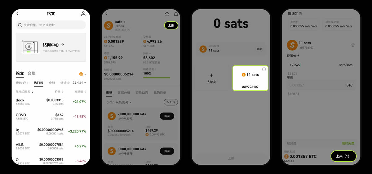 2. 选择可上架的铭文,点击【上架】- 输入价格后,点击【上架】,【确认上架】即可。