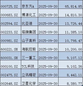 三一重工(600031、TCL科技(000100、立讯精密(002475、卫星化学(002648等,三季度分别增持了9107.12万股、9102.36万股、8442.11万股、8380.77万股。