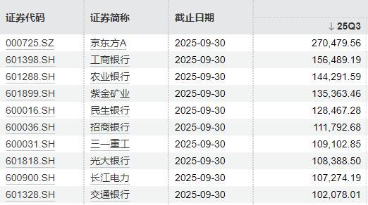 紫金矿业(601899、三一重工(600031、长江电力(600900等股票,持股数量位居前十,分别为13.54亿股、10.91亿股、10.73亿股。