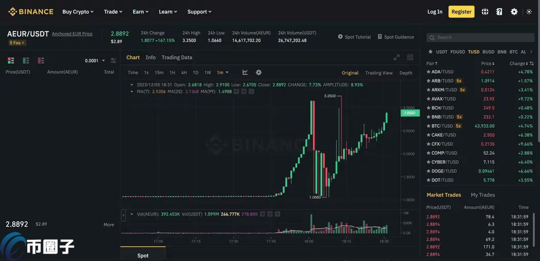 根据币安交易数据显示,「AEUR/usdt」现货交易对上线后的价格基本都在1.08美元左右徘徊,大致与欧元兑美元汇率持平,殊不知却在今日凌晨1点45分开始飙升,短短15分钟内上涨超过200%,**触及3.25美元,成交量也同步激增。
