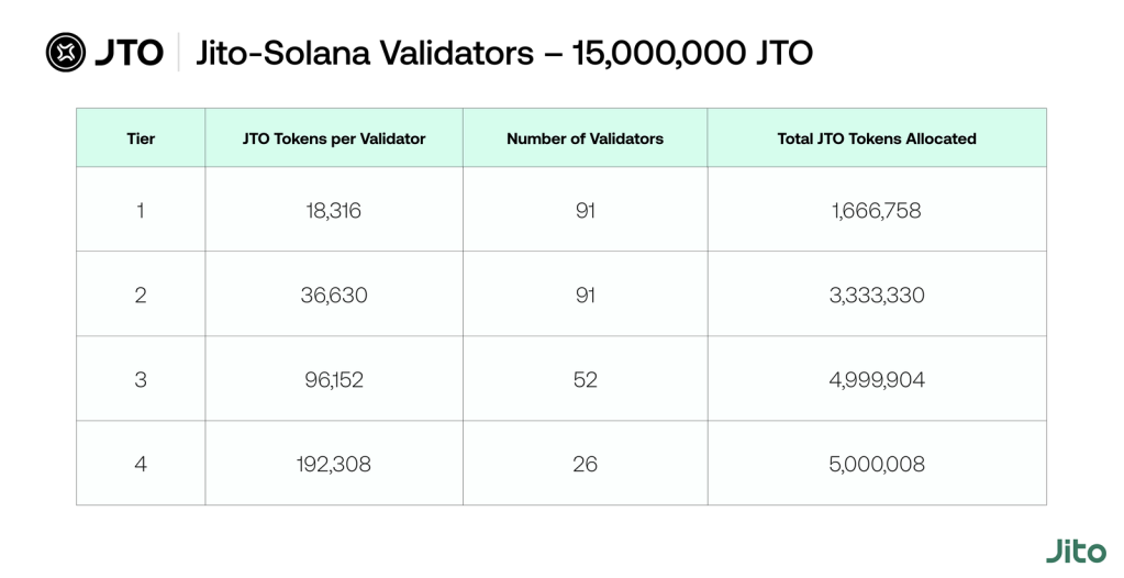 15%JTO空投份额给予节点验证者。验证者获得的空投**的50%的**,将在12个月内线性解锁,分配份额依照节点运行时间分为四级: