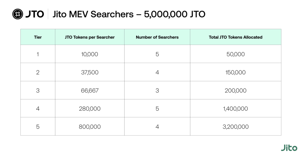 5%JTO空投份额给予MEV搜索者。合格的搜索者依照运行绩效被分为五个**,越活跃的搜索者可以不成比例获得较多的**,与质押用户的分级制度相反。