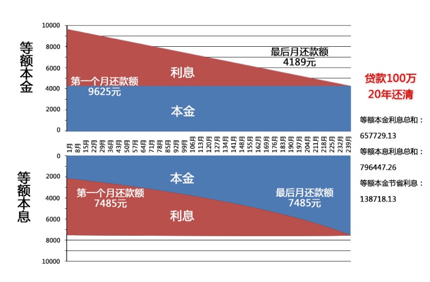 也就是说,按照等额本息的算法,你**个月需要还一万零五百五十多,到了第十个月,也就是**一个月,你需要归还的金额还是一万零五百五十多。我们这么一计算,就会发现,单纯看利息总和的话,等额本金肯定是要小于等额本息的。