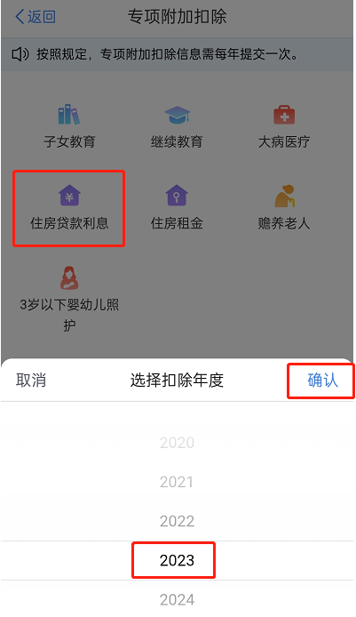 2、选择【住房**利息】以及【扣除年度2023】,点击【确认】;