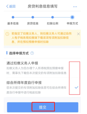 4、按页面提示,依次完成基本信息、房贷信息、扣除比例、申报方式的填写,**点击【提交】即可。