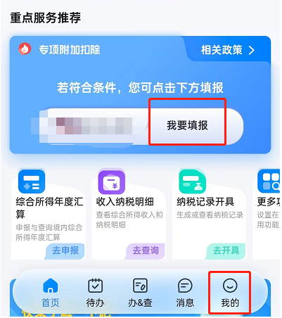 1、打开个人所得税APP,点击“我的”完成注册登录,首页专项附加扣除模块点击【填报】;
