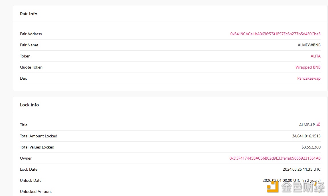 3月27日消息,ALITA在X平台宣布其生态**Meme项目ALME已经成功创建了包含3000 BNB和400,000,000,000 ALME**的流动性池, LP已通过Pinksale锁定,直至2026年3月1日。3月27日21:00(UTC 8)将在PancakeSwap正式开放交易对BNB/ALME。