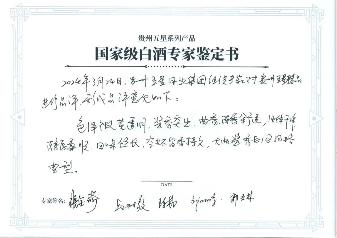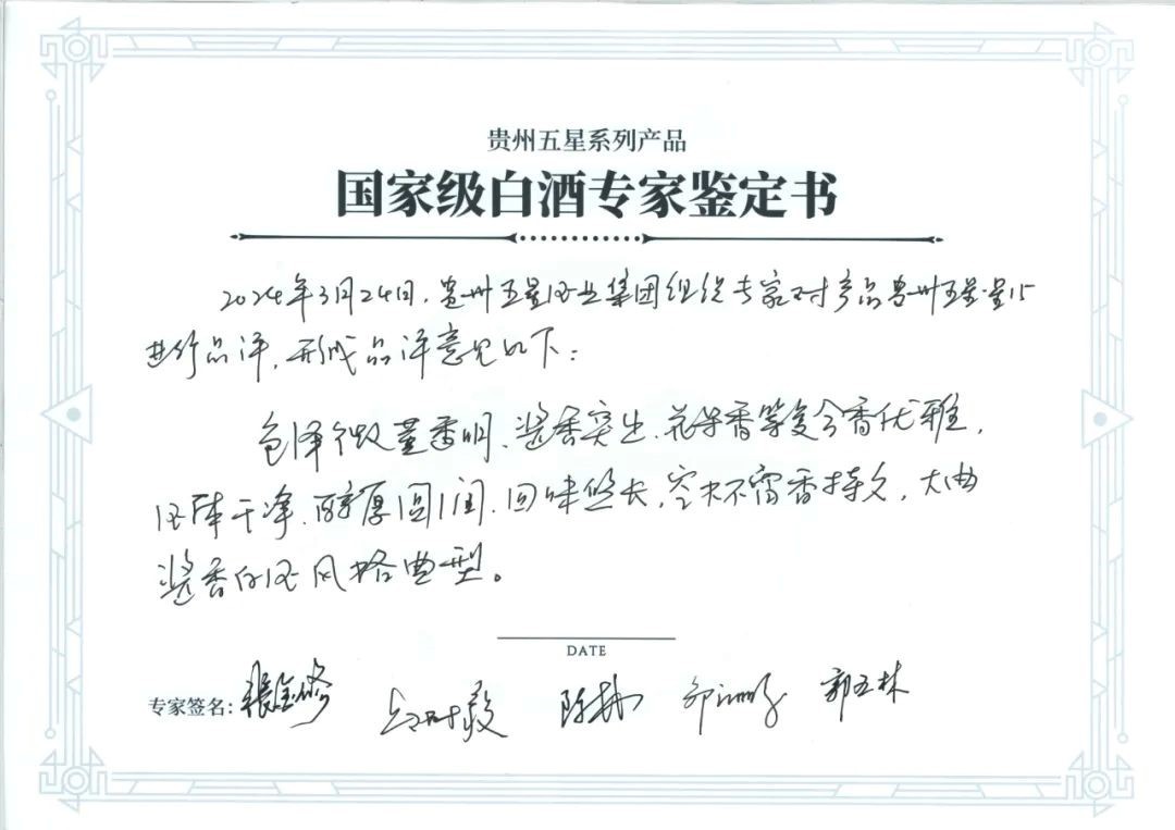 贵州五星·星15品评意见如下:色泽微黄透明,酱香突出,花果香等复合香优雅,酒体干净,醇厚圆润,回味悠长,空杯留香**,大曲酱香白酒风格典型。