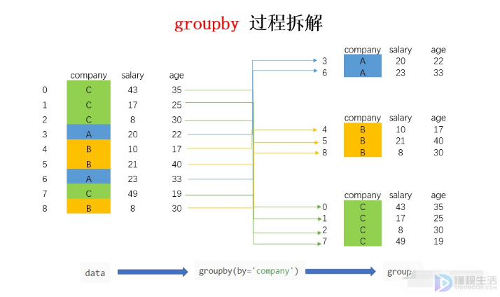 转换成列表的形式后,可以看到,列表由三个元组组成,每个元组中,**个元素是组别(这里是按照company进行分组,所以**分为了A,B,C),第二个元素的是对应组别下的DataFrame,整个过程可以图解如下:
