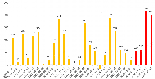 南向资金月度净买入情况(港币,亿元)2022年-2024年4月