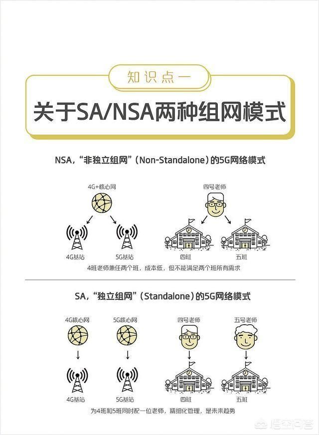 这里,中科院的博士小哥哥们做了个比喻——将"基站"比喻为"学生";将"核心网"比喻为"老师"。NSA(非独立组网)便是一个老师带领两个班学生(一个核心网带两种基站);SA(独立组网)则是一个老师带领一个班学生(一个核心网配一种基站)。