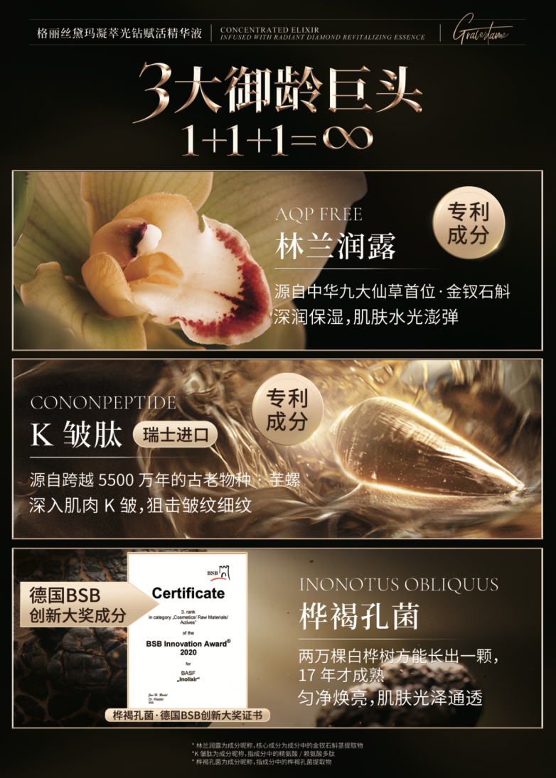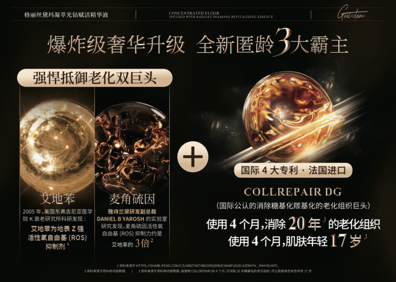 格丽丝黛玛的专家研发团队深知,想要打造一款优质的抗衰产品,需要在成分研究方面,投入海量的精力,才能真正取得实质性的进展。全新光钻时空精华PRO在原有的奇迹御龄联盟精粹3大核心成分:林兰润露(金钗石斛)、抗皱肽(源自深海芋螺)、桦褐孔菌的加持下,更融入了全新抗衰成分“麦角硫因”&“艾地苯”。