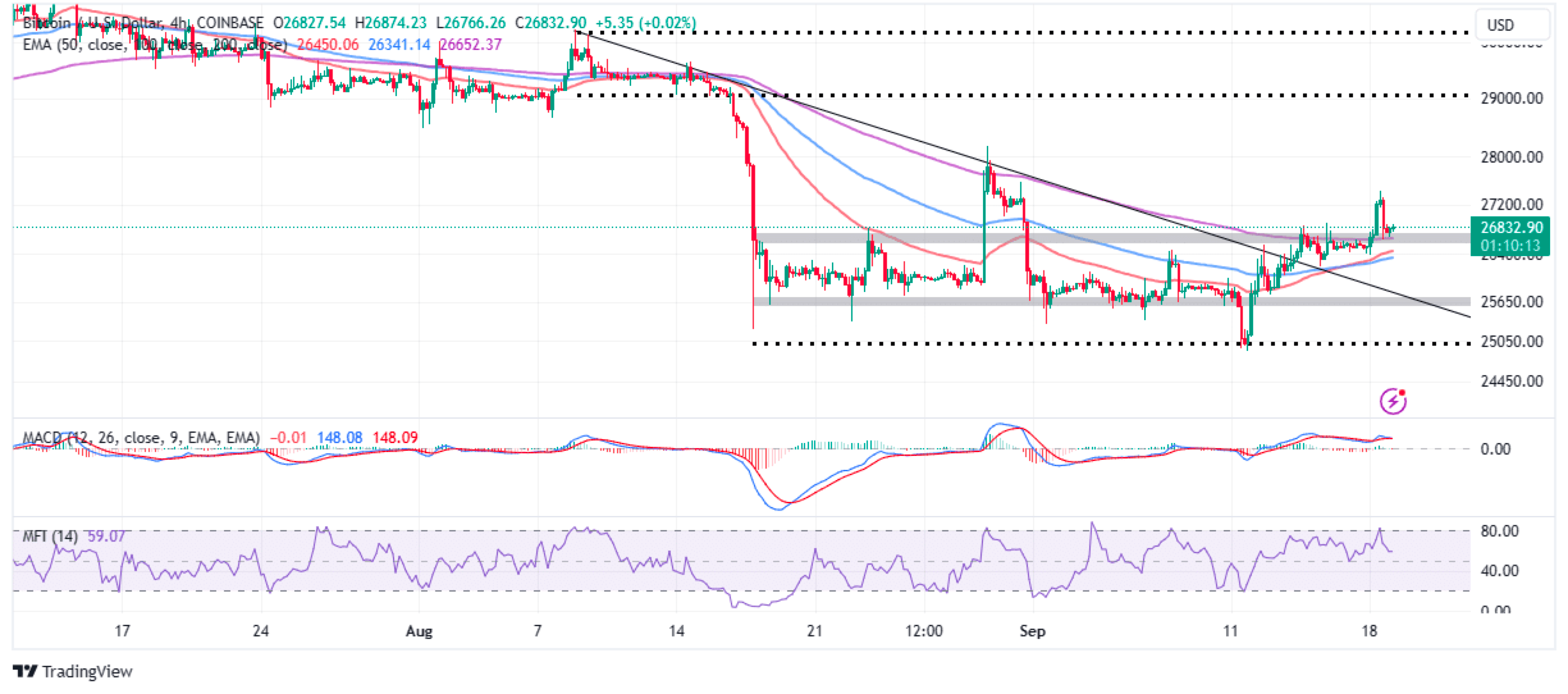 通道上限和 200 天指数移动平均线 (EMA)(紫色)在 26,652 美元形成的汇合为近期下行提供了支撑。