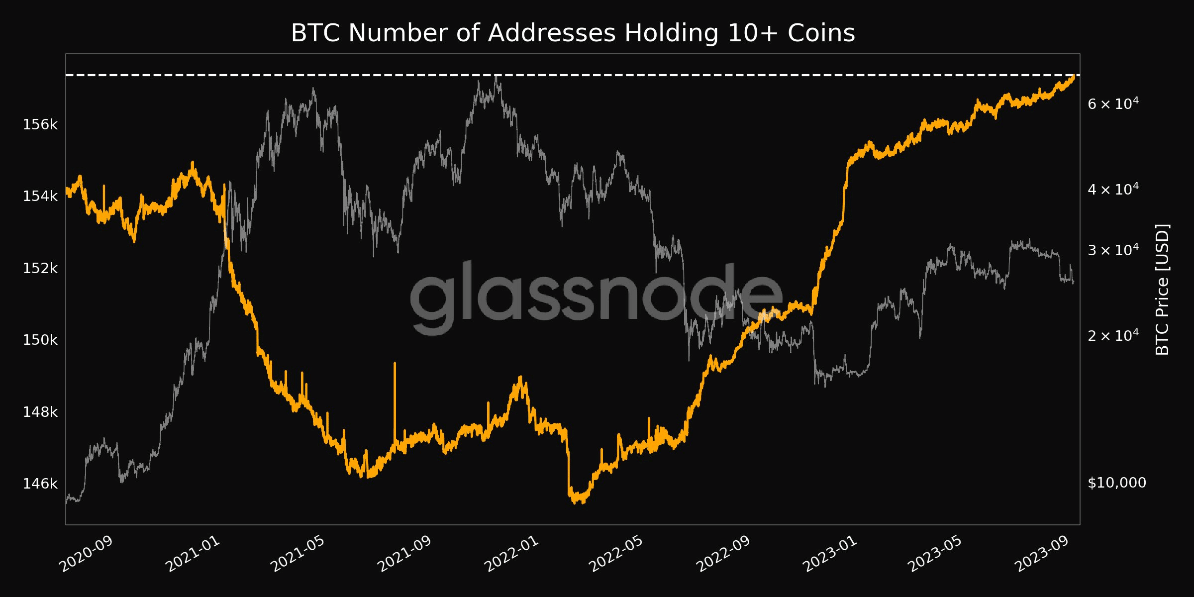 根据 Glassnode 的数据,拥有超过 10 美元 BTC 的比特币钱包地址越来越显示出其增长潜力的韧性。数据显示,持有 10 个以上比特币的地址数量目前达到 157,352 个,创 3 年来新高,自 2023 年 1 月以来一直保持稳定增长记录。