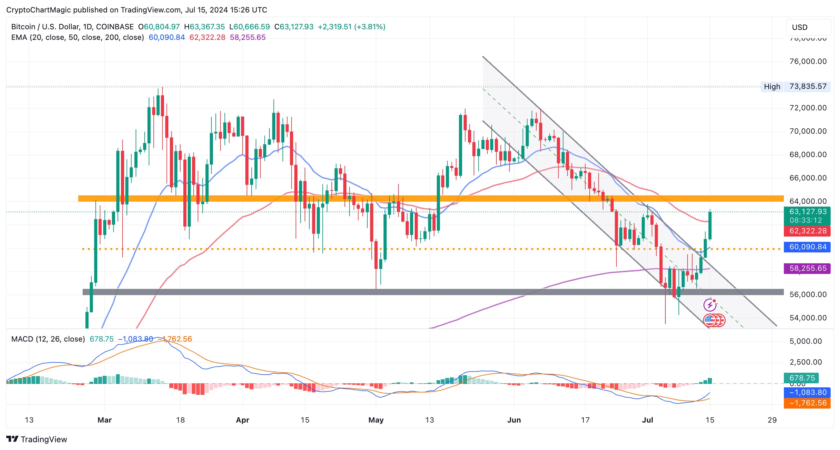 受美国前总统唐纳德·特朗普遇刺事件影响,加密货币市场价格周末重新走强。比特币价格反弹至关键的 60,000 美元上方,并于周一继续上涨至 63,000 美元以上。