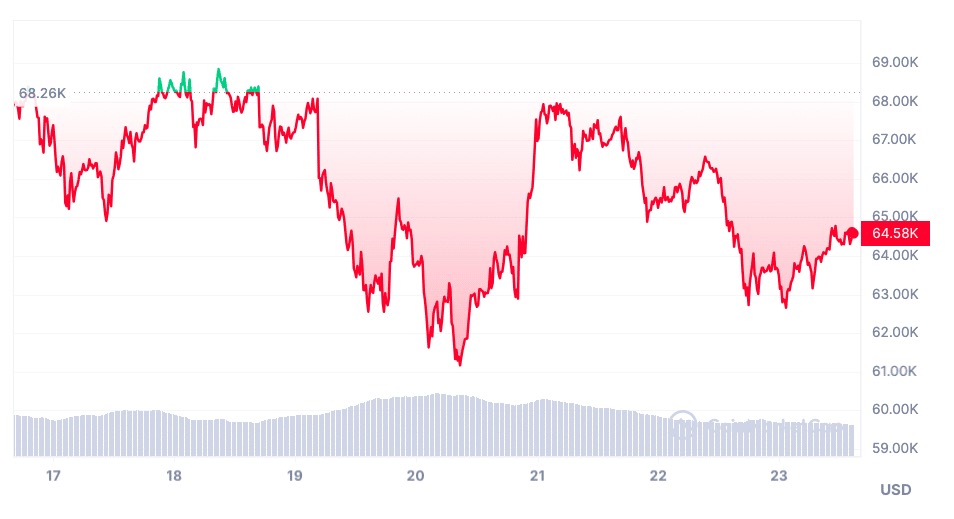 今天,比特币价格为 64,714.38 美元,交易范围为 62,355 美元至 64,834.24 美元。交易量下降11.21%,达到365.4亿美元。这表明买卖交易水平有所下降。交易者可能不太感兴趣或不确定,**导致波动性**。根据CoinMarketCap 的数据,比特币的市值为 1.27 万亿美元,流通量为 19,661,956 BTC,继续占据市场**的位置。