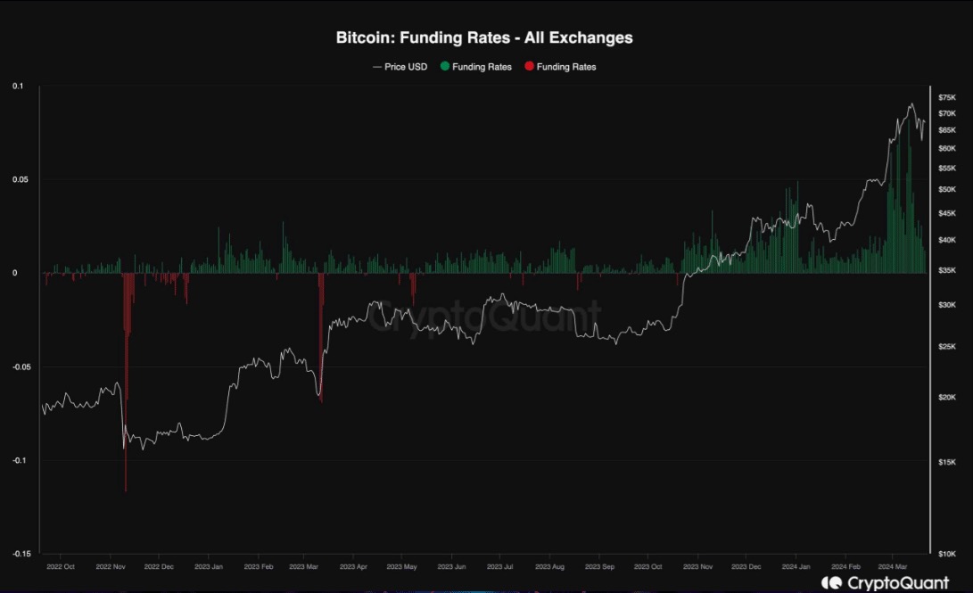 CryptoQuant 图表显示比特币融资利率,表明买家或卖家是否更积极地执行订单。高融资率往往会引发漫长的清算连锁反应。因此,虽然有必要拥有正的融资利率,但过高的融资利率可能会令人担忧。