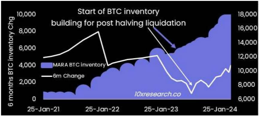 蒂伦表示,全球**的比特币挖矿公司马拉松已经建立了库存储备,“这些库存可能会在减半后逐渐出售,以防止收入下降”。