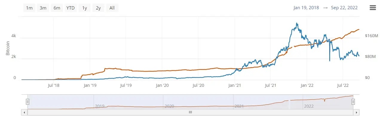 这使得闪电网络对于全球范围内的广泛采用至关重要,将比特币从价值储存手段转变为交易费用**的日常加密货币。说到这里,每笔 BTC 交易的基本费用仅为 1 聪(0.00000001 BTC),相当于 0.0002 美元。从 2019 年到 2022 年,LN 的渠道数量增加了 377%。截至 2022 年 9 月,LN 将所有支付渠道的累积 BTC 容量增加至 4,700 BTC(蓝色是美元价值,橙色是 BTC)。