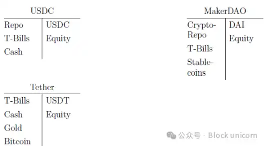 · USDT:主要由链下储备支持。Tether 的模型是部分储备,因为每个 USDT 并非 1: 1 由现金或现金等价物(如短期国债)支持,还包括商业票据和公司债券等其他资产。