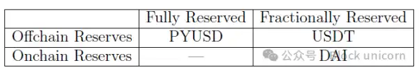 Sebastien 根据稳定币的储备性质(如 RWA 的链下资产与链上加密资产)以及模型是**储备还是部分储备,使用二维矩阵对稳定币进行分类。