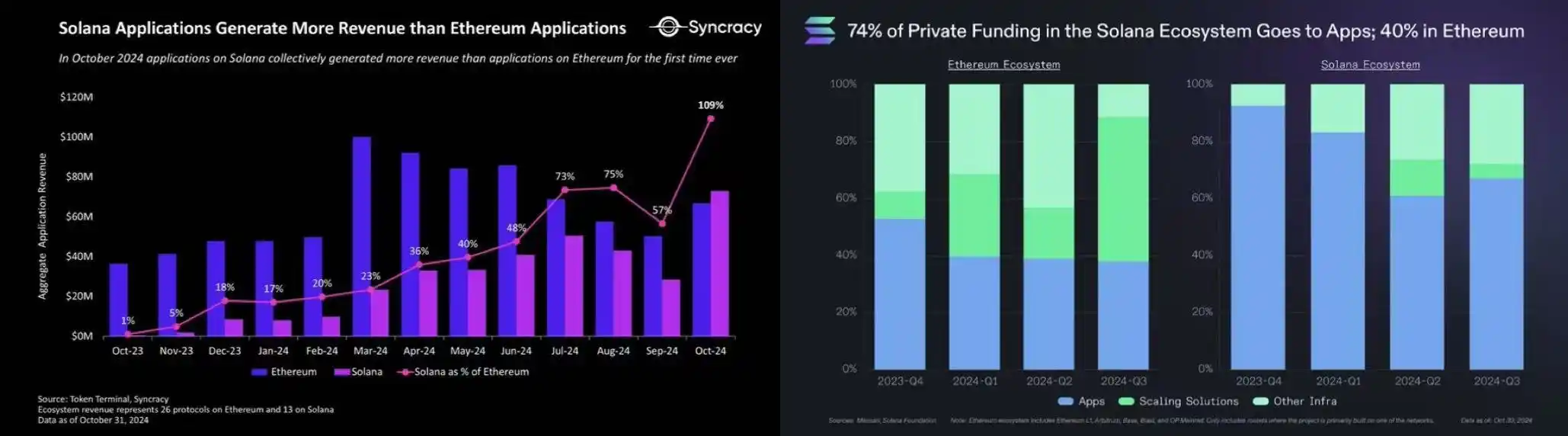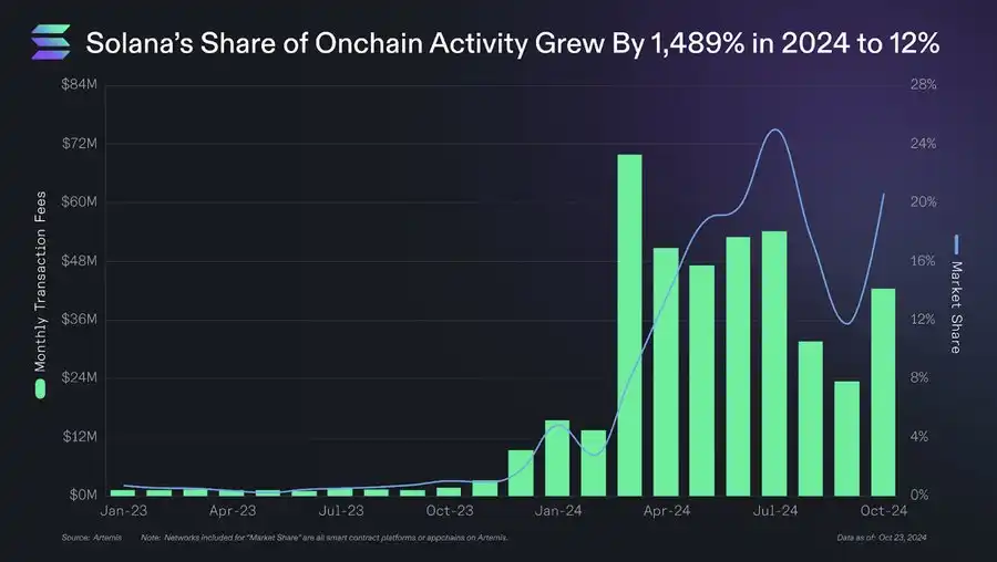 相比之下 Solana 的生态系统选择押注产品,这一点在 2024 年的 Breakpoint 大会上得到了体现。通过专注于创始人、应用程序和**化,Solana 在交易手续费市场的份额——生态系统活动和整体健康的**指标——在 2024 年增长了 1,489%,达到 12%。