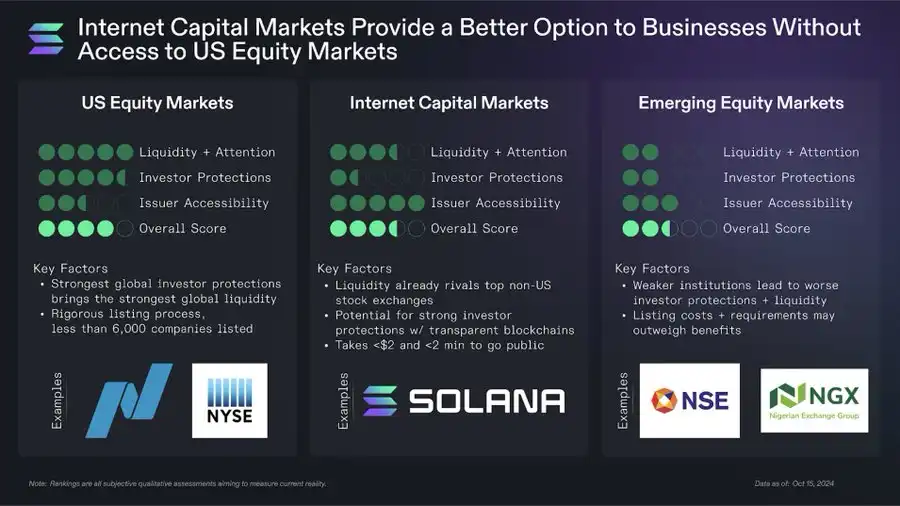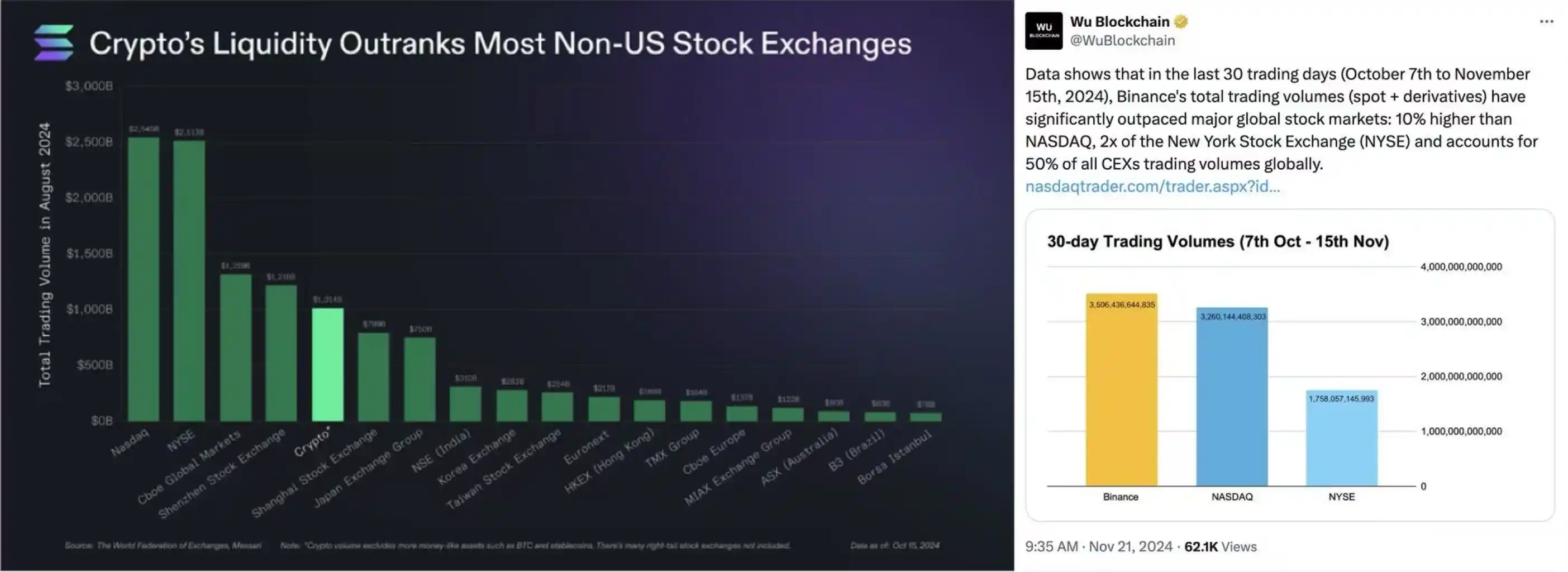 机会既简单又巨大:目前,全球只有约 15% 的人口能够参与美国资本市场——这是全球流动性**的市场。而许多其他**的资本市场缺乏流动性、准入成本高昂,结算效率低下。加密货币市场则更具可访问性和流动性。在高峰期,其交易量甚至超过 NASDAQ 和 NYSE,我们有机会在互联网上构建**的资本市场。