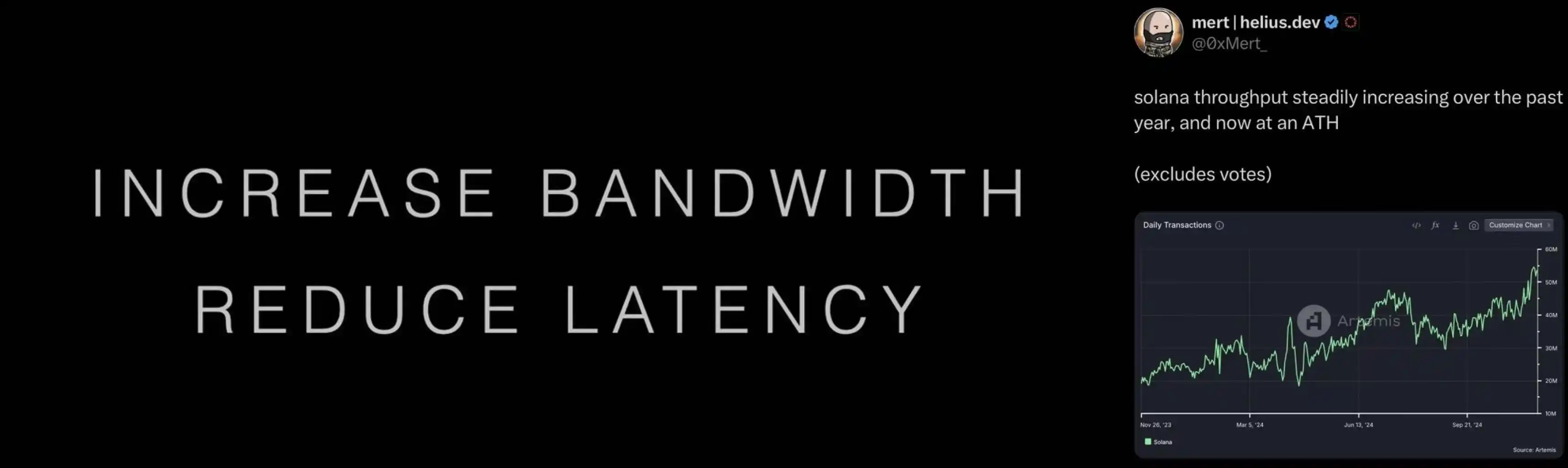 专注于核心协议的团队(如 Anza、Jump、Jito 等)每天都在努力提升性能和优化体验。他们通过推动硬件和软件的极限,来提高 Solana 在基础层的性能和容量。提高带宽,减少延迟是 Solana 的一项关键策略,强调了 Solana 持续致力于实际使用的基础设施建设,而非单纯为了估值。