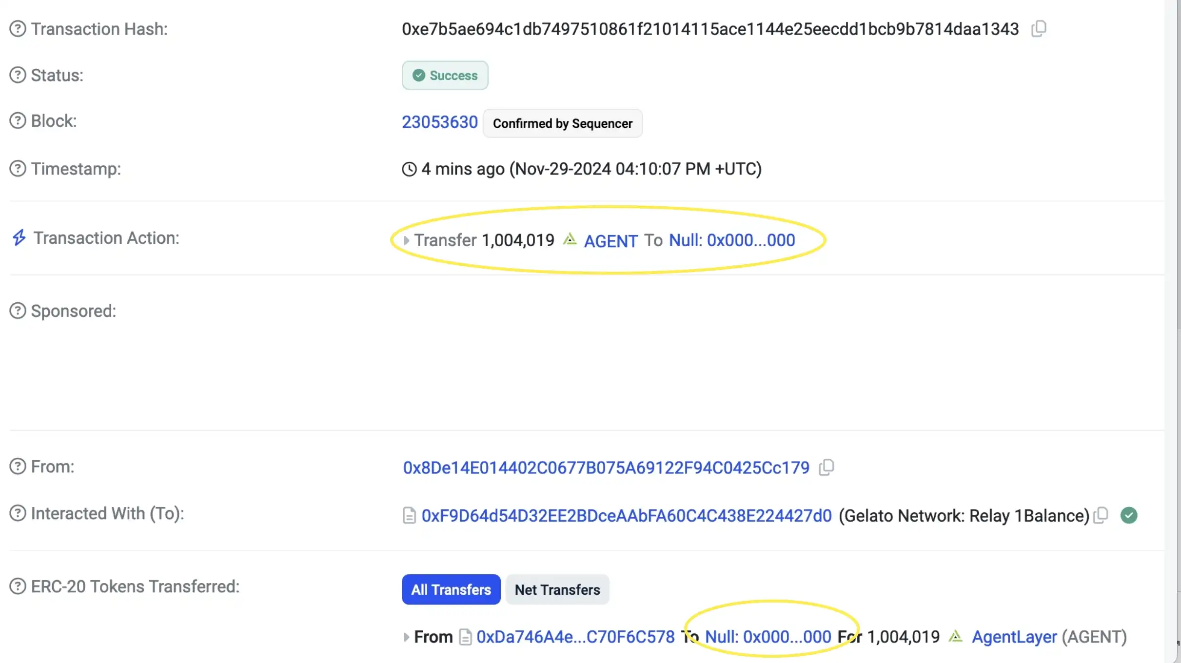 在 AgentLayer 迎来一周年之际,为进一步提升$AGENT **的价值与稀缺性,并维护**经济的平衡,AgentLayer 于新加坡时间 11 月 30 日正式完成了****销毁事件。此次销毁不仅标志着 AgentLayer 在**管理上的新举措,也预示着$AGENT **未来价值的稳步提升。