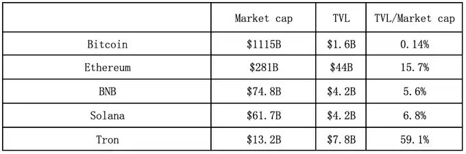 具有智能合约功能的主流公链的 TVL 与市值比率要高得多:以太坊为 14%,Solana 为 6%,Ton 约为 3%。即使按照 1% 的比例,BTCFi 也有十倍增长的潜力。