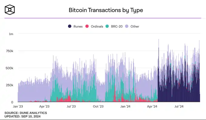 交易量方面,资产的多元化已经推动了交易**的提升。The Block 数据显示,过去 1 年 BTC 日均转账已经超过 500k/天,其中 RUNES 和 BRC-20 已经占据了主导。接下来交易、借贷、信用派生、生息的需求也变得顺利成章,BTCFi 能够使得比特币成为一种生产性资产,允许 BTC 从其持有的资产中赚取收益。