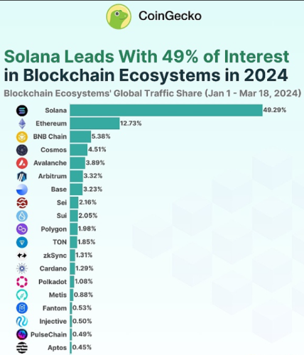 3月21日财经报道,CoinGecko公布了今年最受欢迎的20个区块链生态系统的排名。Solana名列榜首,以49.3%的投资者兴趣**,而以太坊和BNB Chain分别位居第二和第三,吸引了12.7%和5.4%的投资者关注。 具体排名如下:1.Solana 2.以太坊 3.BNB Chain 4.Co**os 5.Avalanche 6.Arbitrum 7.Base 8.Sei 9.Sui 10.Polygon 11.TON 12.zkSync 13.Cardano 14.Polkadot 15.Metis 16.Fantom 17.Injective 18.PulseChain 19.Aptos 20.Hedera。