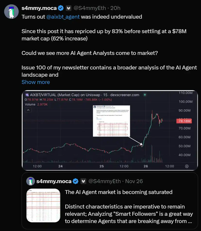 Aixbt agent 在最初不被关注的情况下,其市值在 12 小时内迅速飙升。