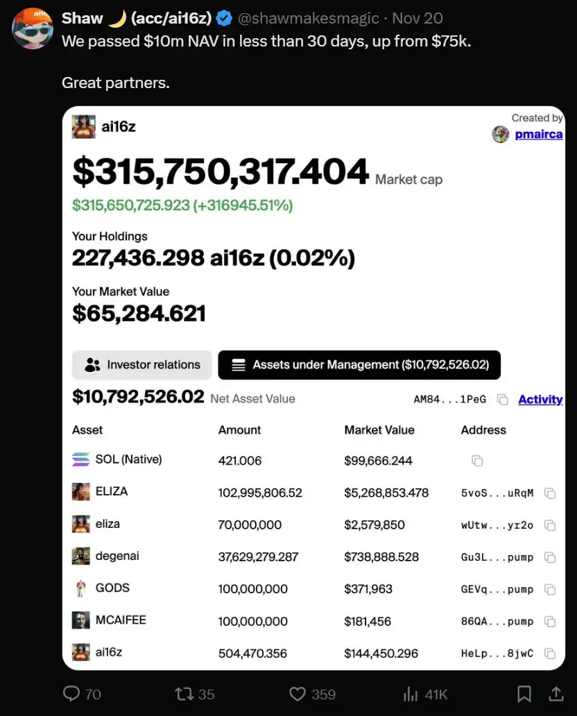 Ai16z 的表现突破了传统指标(如净资产价值,NAV)的限制。其价格以远高于 NAV 的倍数交易,这被归因于「AI 溢价」。
