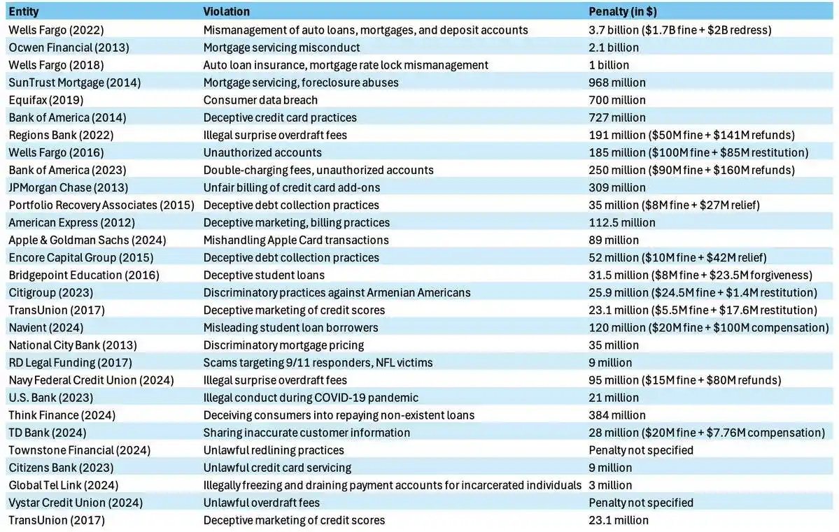 在 CFPB 的执法记录中,我没有找到**与去银行化直接相关的和解案件。以下是他们按金额排序的 30 大和解案件: