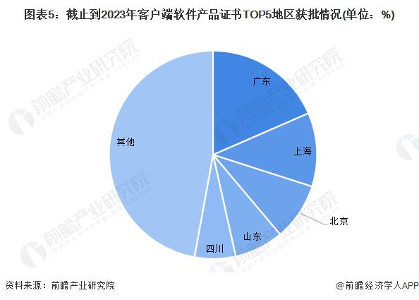 从地区的角度来看,客户端软件产品证书主要集中在广东、上海、北京、山东和四川。其中,广东的客户端软件产品获批证书有29张,占比为18.47%,位列**。