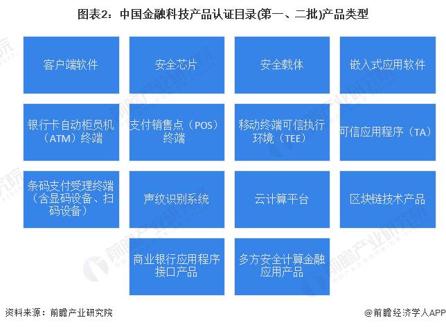 截止到2023年3月,我国金融科技产品主要包括了客户端软件、安全芯片、安全载体、嵌入式应用软件、银行卡自动柜员机(ATM)终端、支付销售点(POS)终端、移动终端可信执行环境(TEE)、可信应用程序(TA)、条码支付受理终端(含显码设备、扫码设备)、声纹识别系统、云计算平台、区块链技术产品、商业银行应用程序接口产品和多方安全计算金融应用产品等14个细分产品。