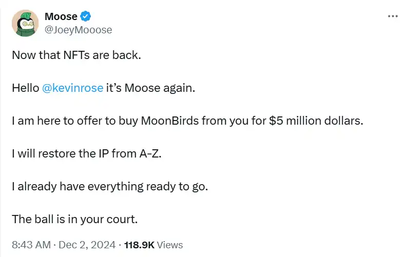 但大概率他是开玩笑的,因为在昨天他还表示要花 500 万美元向 Kevin Rose 买 MoonBirds。但哥们,MoonBirds 早被 Yuga Labs 给收了...