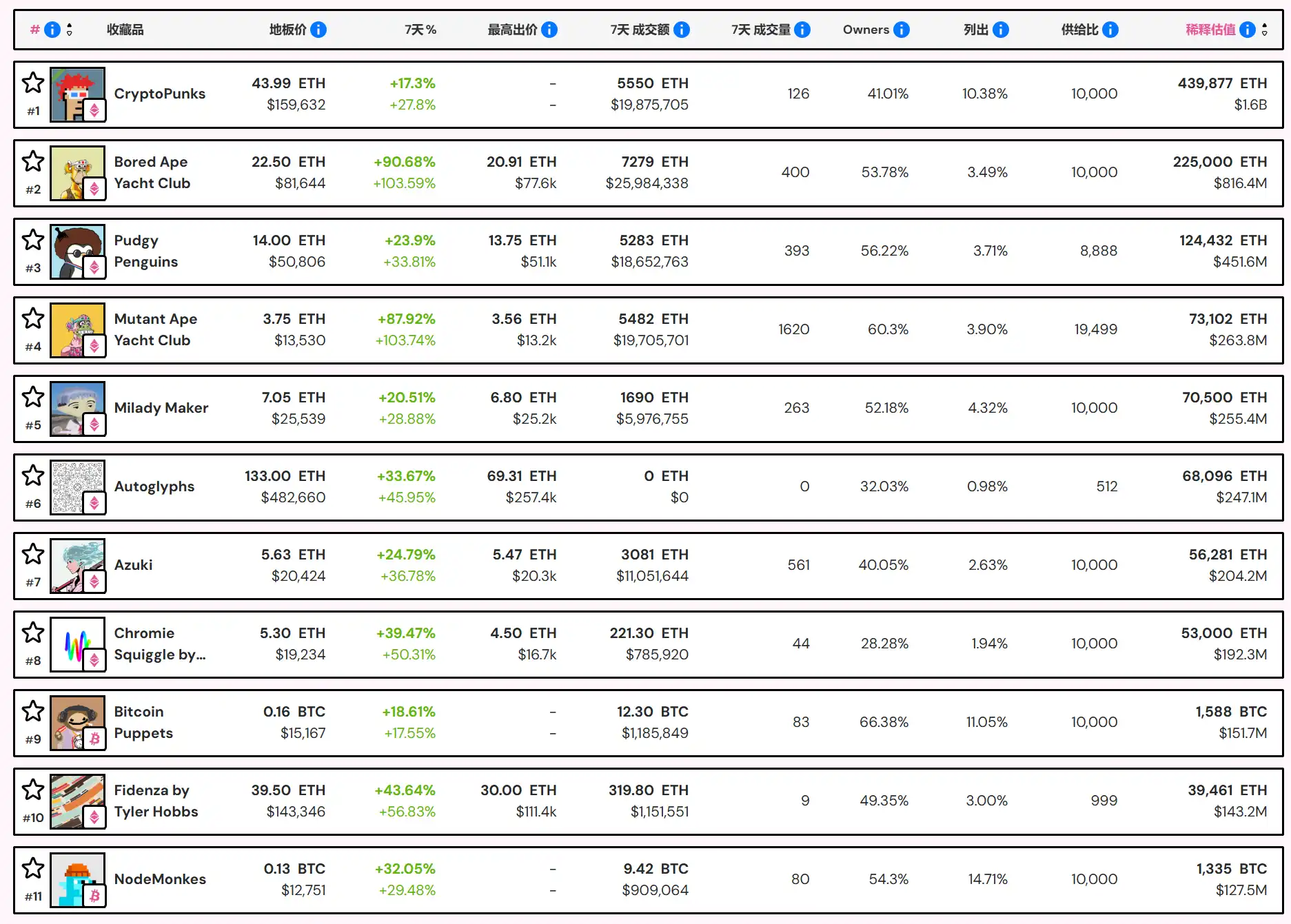 过去 7 天,NFT 老蓝筹集体回暖。无论是 CryptoPunks、BAYC、MAYC、Azuki、Doodles 这些曾经的头部 PFP,还是 Chromie Squiggle、Fidenza 这些头部生成艺术 NFT,都出现了较大幅度的反弹。