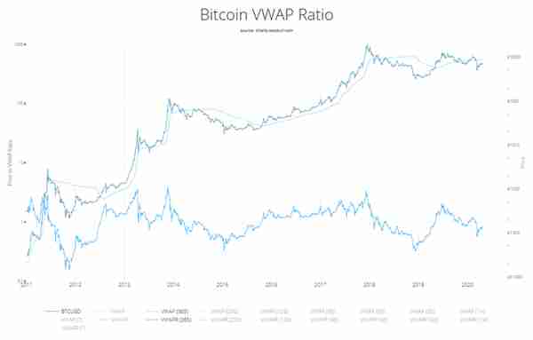 因计算周期的不同,VWAPR会有所不同:短周期(7至90日)加权值可以用来判断短期的高点或低点,而长周期的适合判断大周期上的高点和低点。这里只将365日的加权值与MVRV进行对比。观察过往十年的VWAPR(365日)可以发现,2012年、2015年和2019年的熊市底点附近所对应的VWAPR值都低于0.4,2011年、2013年和2017年的峰值都在3.0以上。可以看出,VWAPR(365)与MVRV的判断准确性极为接近,但前者会根据选取周期不同变得灵活多变。